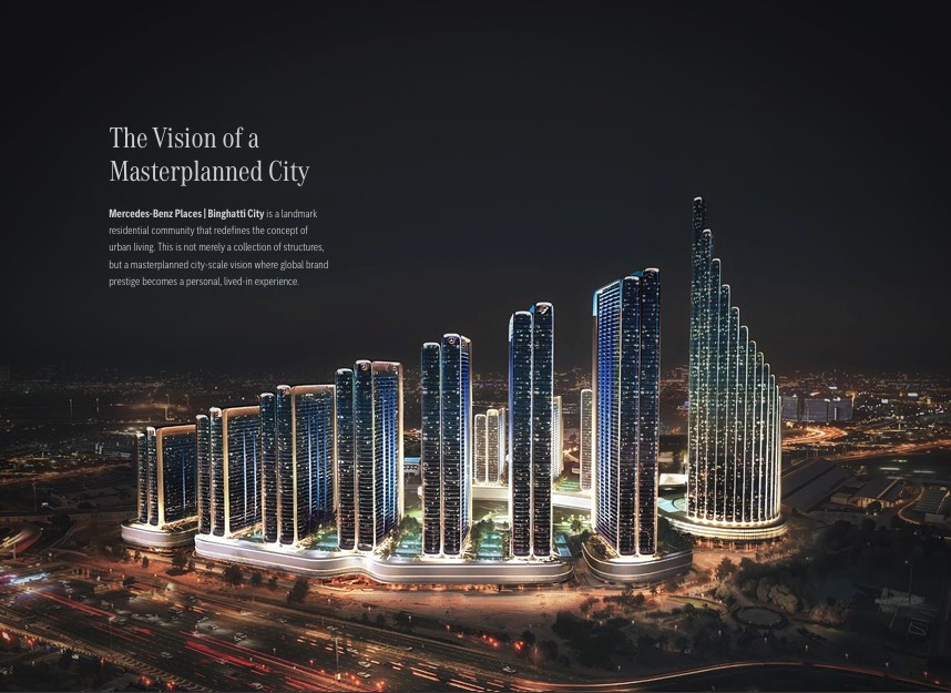 Mercedes-Benz Places – Binghatti City is a landmark master-planned development by Binghatti Developers, created in partnership with Mercedes-Benz. Located in Meydan, Dubai, this iconic project introduces the world’s first Mercedes-Benz branded city, redefining luxury urban living through innovative design, premium craftsmanship, and future-ready infrastructure.