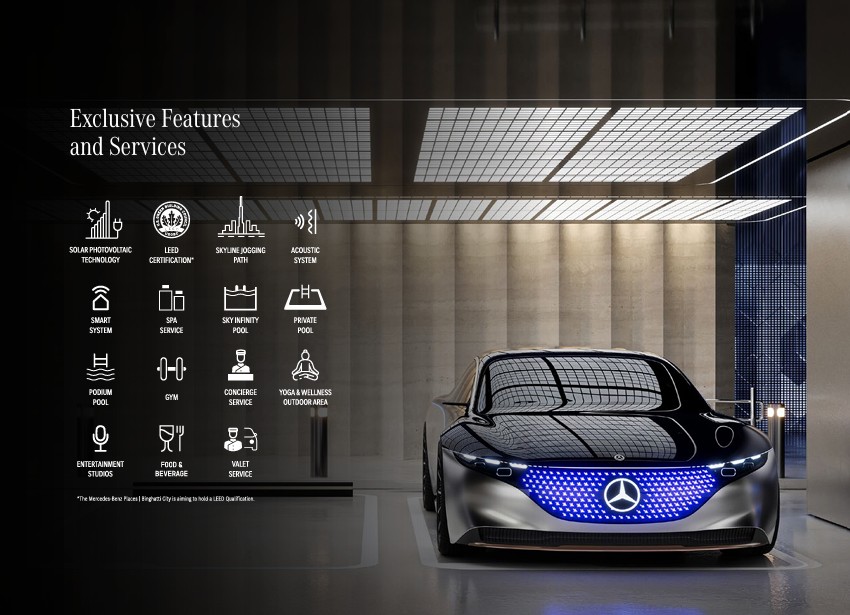 Inspired by Mercedes-Benz’s renowned “Sensual Purity” design philosophy, the architecture and interiors reflect elegance, minimalism, and timeless luxury. Every element is thoughtfully curated to deliver a refined lifestyle experience that blends comfort, aesthetics, and functionality.